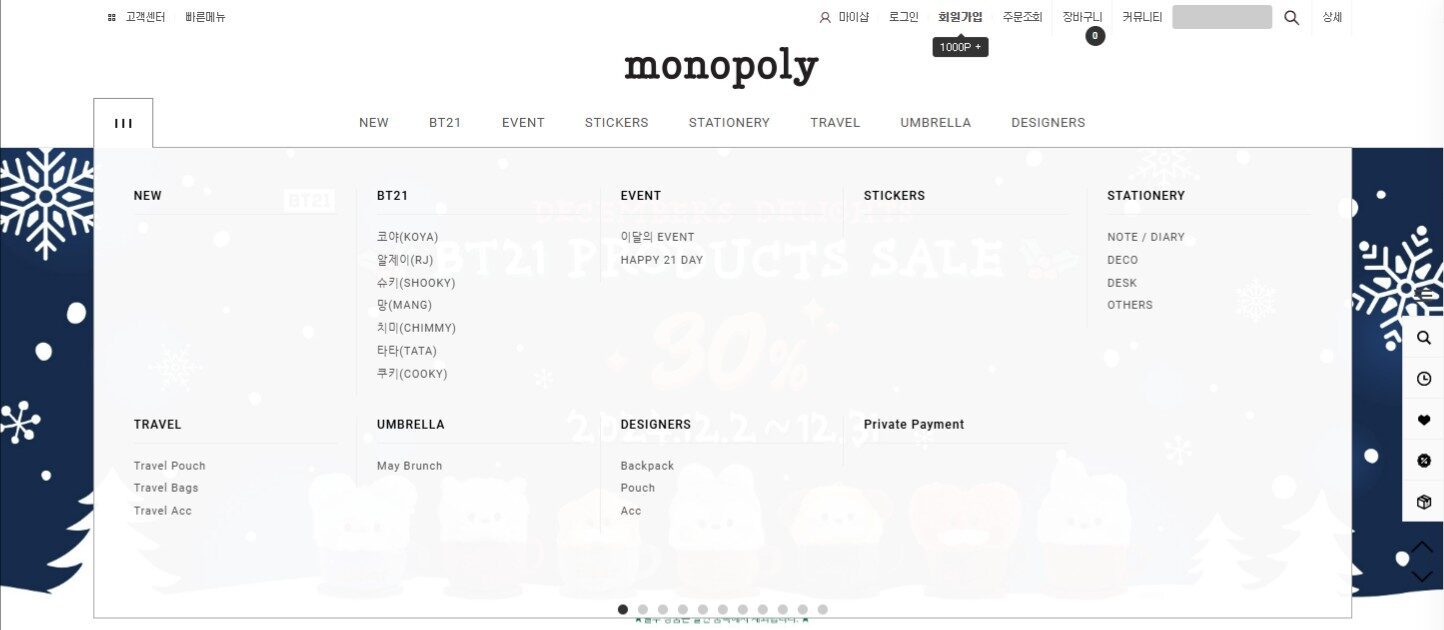 Monopoly online store (https://monopoly.co.kr/) is renowned for its unique designs and high-quality products. Here, you can find character dolls, stickers, stationery, and a variety of other items that reflect the Korean lifestyle.